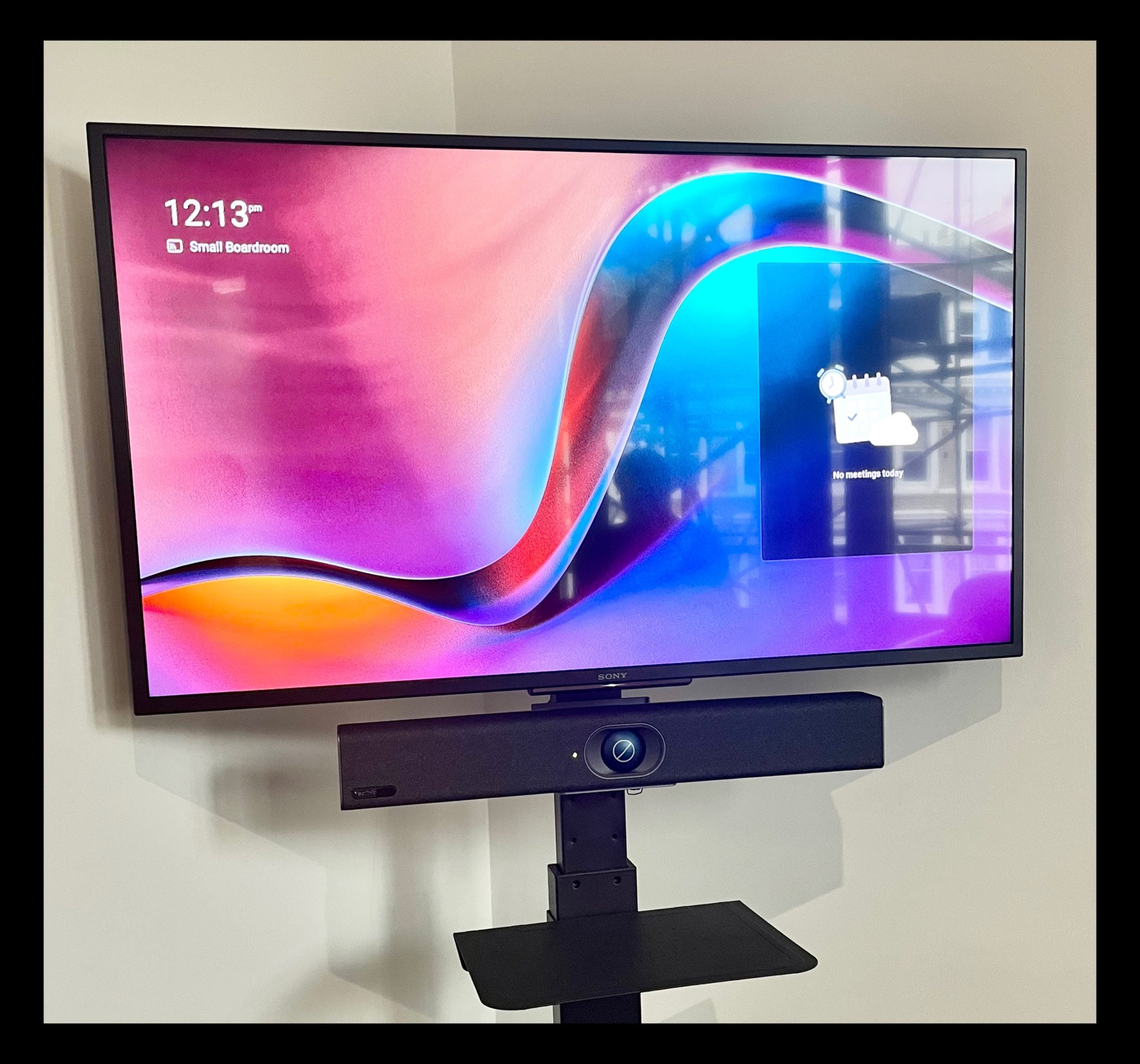 The smaller huddle room is designed for more intimate meetings of up to 5 people. In this space we installed and provisioned a simpler A20 meeting bar under the existing stand-mounted TV. The smart bar unit contains a high-quality camera, speaker and mics.